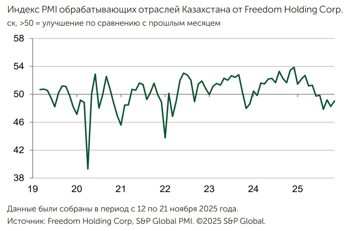 Индекс деловой активности обрабатывающих отраслей Казахстана от Freedom Holding Corp. в ноябре повысился до 49,0 по сравнению с 48,3 в октябре, но по-прежнему продемонстрировал ухудшение условий ведения бизнеса, хотя можно говорить о признаках стабилизации обстановки, говорится в сообщении S&P Global.