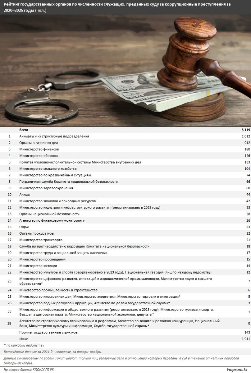 Анализ данных Генеральной прокуратуры Казахстана за последние пять лет показал, что акиматы остаются самыми коррумпированными ведомствами Казахстана. Finprom составил рейтинг государственных ведомств по численности служащих, которых обвинили в коррупционных преступлениях и предали суду.
